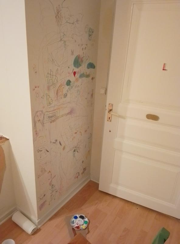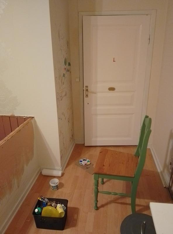Here are some before shots of the space and a first sketch. The old wallpaper was also anything but ideal as a surface.