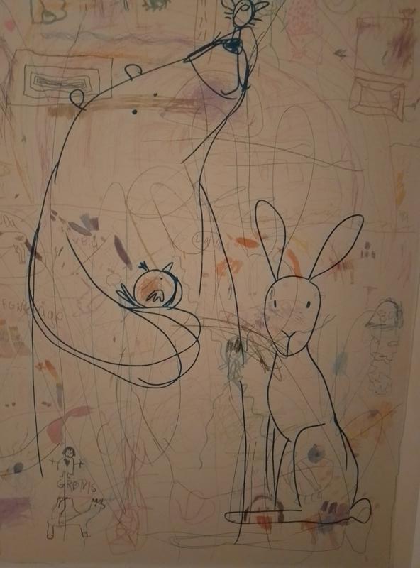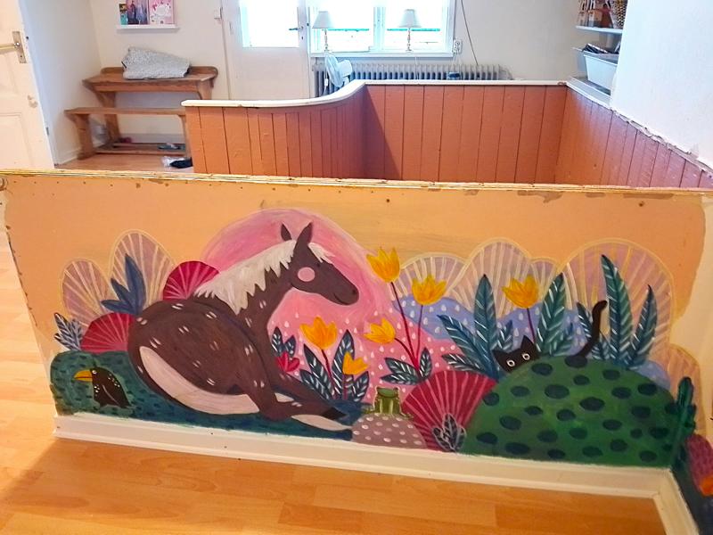 But beside that I haven’t managed to pick up a pen in the last two months. My excuse is “not having” the time but I think it is rather “not taking” it. However, I managed to use a paintbrush and did a mural while visiting a friend. I was equipped with bad paint, one very used paintbrush, limited time and only a vague idea of what to do.