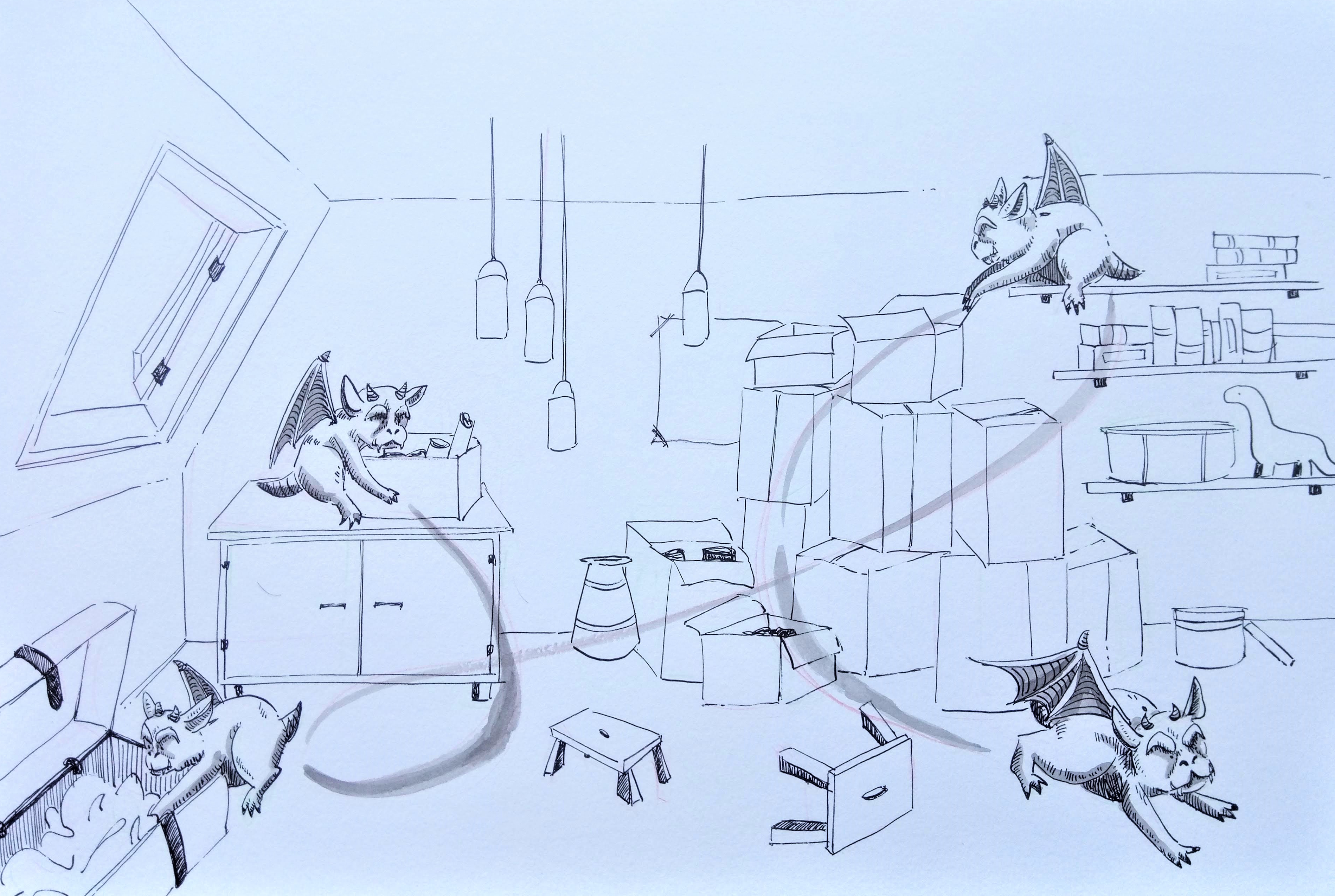 Grog jumped off his usual outdoor wall spot. Maybe someone had put his wing in the attic? He scurried around, looking here and there. But his wing was nowhere to be found.