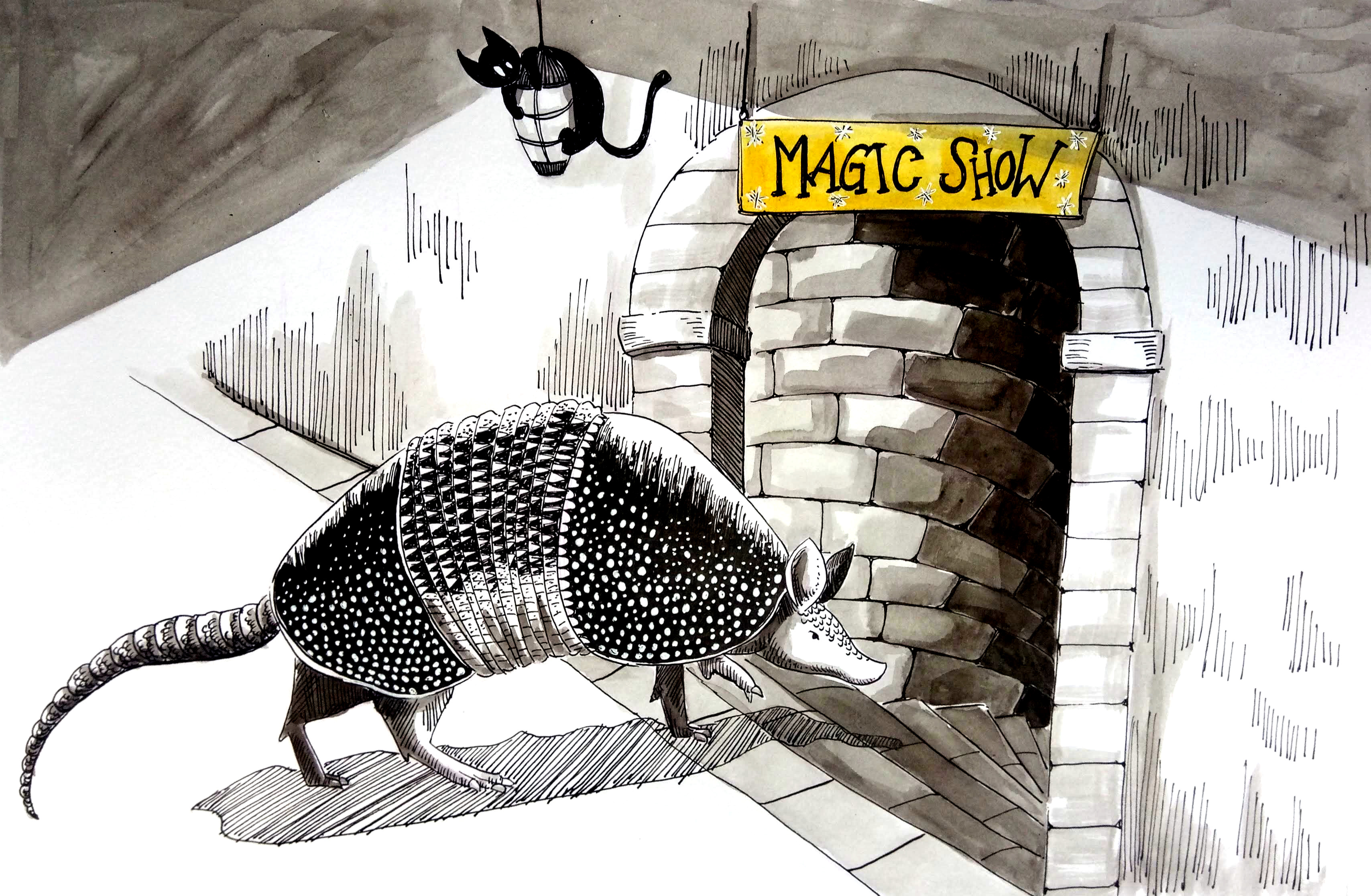 When they get around the next corner, the armadillo has disappeared. At the end of the street they spot a basement entrance. “A magic show!” Grog yells. “Maybe that´s how I can get my wing back!”
